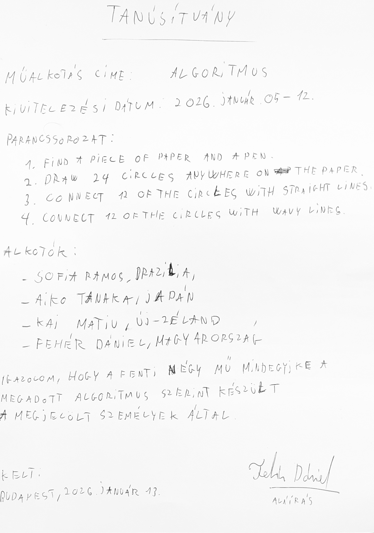 "Igazolom, hogy a fenti négy mű mindegyike a megadott algoritmus szerint készült a megjelölt személyek által."